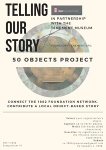 C. 50 Objects Project – 1882 Foundation x Tenement Museum: Contribute an object and a brief description of its significance to the Chinese American experience. As we collect our partner organizations’ objects and stories into 2018, we will develop a page with the Tenement Museum’s Your Story, Our Story platform to represent our stories.